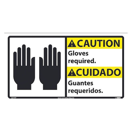 NMC CBA14P Bilingual OSHA Sign, Legend "CAUTION - Gloves required." with Graphic, 18" Length x 10" Height, Pressure Sensitive Vinyl, Yellow/Black on White