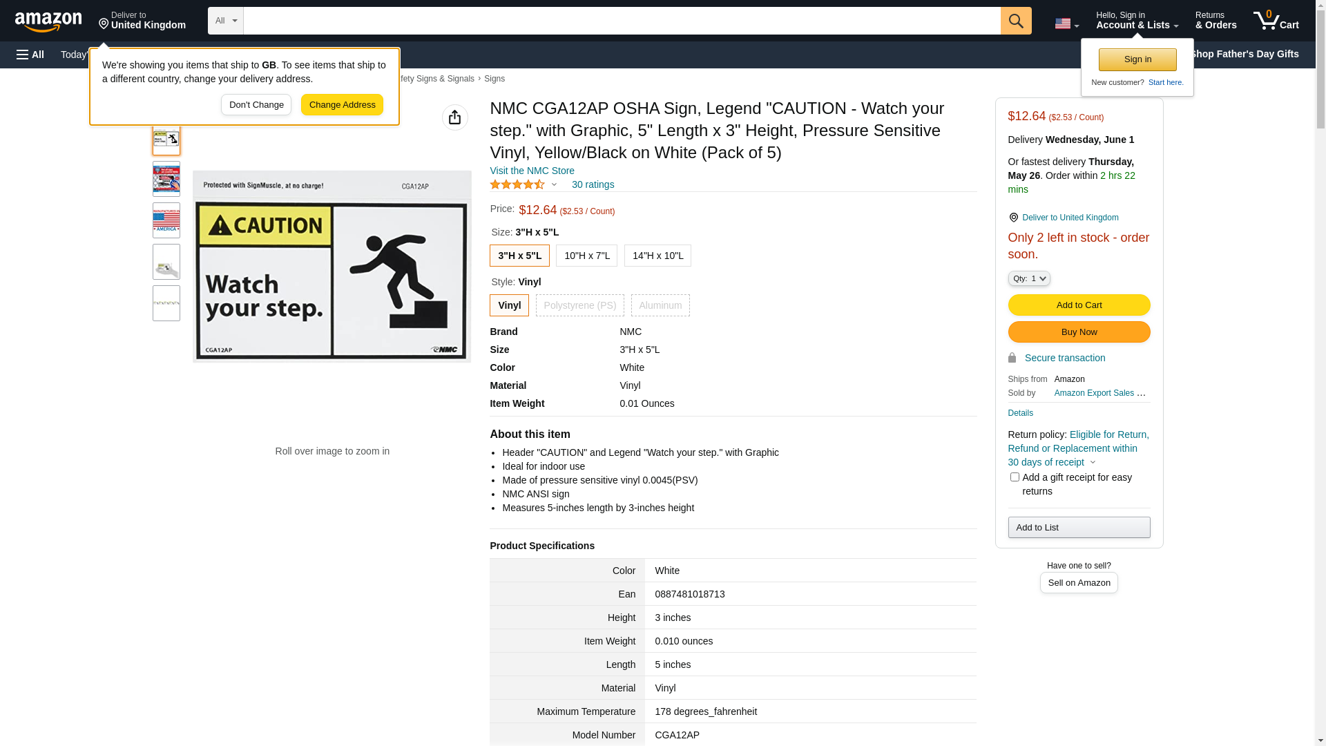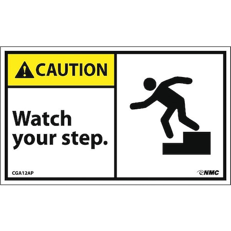 NMC CGA12AP OSHA Sign, Legend "CAUTION - Watch your step." with Graphic, 5" Length x 3" Height, Pressure Sensitive Vinyl, Yellow/Black on White (Pack of 5)