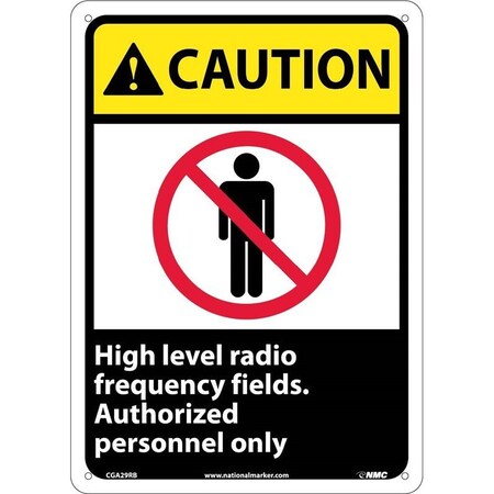 NMC CGA29AB OSHA Sign, Legend "CAUTION - High level radio frequency fields authorized personnel only." with Graphic, 10" Length x 14" Height, Aluminum, Red/Yellow/Black on White