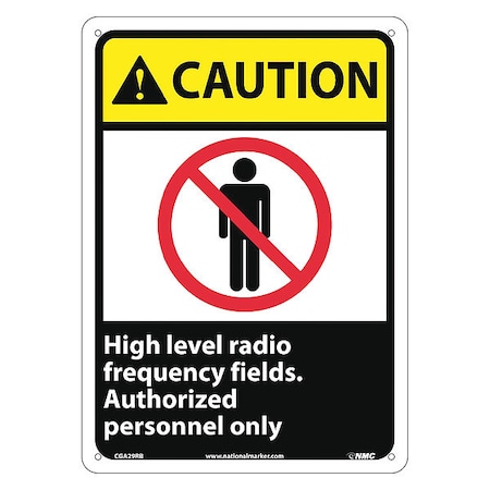 NMC CGA29RB OSHA Sign, Legend "CAUTION - High level radio frequency fields authorized personnel only." with Graphic, 10" Length x 14" Height, Rigid Plastic, Red/Yellow/Black on White