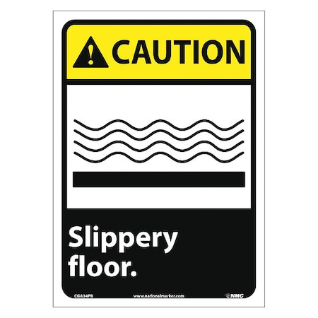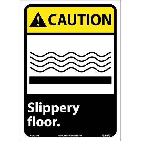 NMC CGA34PB OSHA Sign, Legend "CAUTION - Slippery floor." with Graphic, 10" Length x 14" Height, Pressure Sensitive Vinyl, Yellow/Black on White