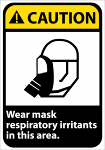 - Clearly Visible: the legend “CAUTION – Wear mask – respiratory irritants in this area.” is printed in legible text to ensure better readability. The graphic of a head wearing a full face respirator makes the message easy to understand