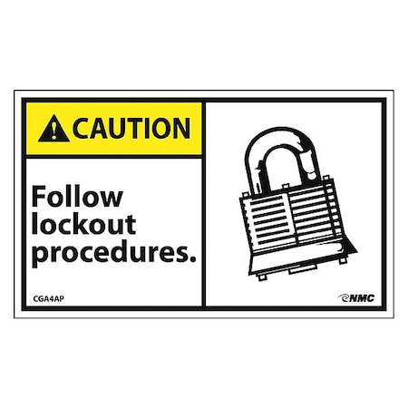 NMC CGA4AP OSHA Sign, Legend "CAUTION - Follow lockout procedures." with Graphic, 5" Length x 3" Height, Pressure Sensitive Vinyl, Yellow/Black on White (Pack of 5)