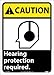 | Feature | Header "CAUTION" and Legend "Hearing protection required." with Graphic |