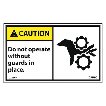 NMC CGA6AP OSHA Sign, Legend "CAUTION - Do not operate without guards in place." with Graphic, 5" Length x 3" Height, Pressure Sensitive Vinyl, Yellow/Black on White (Pack of 5)