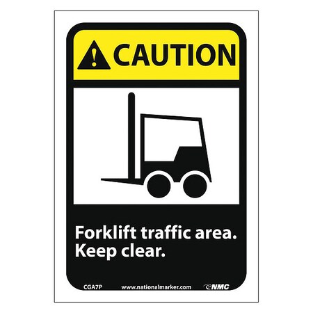 NMC CGA7P OSHA Sign, Legend "CAUTION - Forklift traffic area. Keep clear." with Graphic, 7" Length x 10" Height, Pressure Sensitive Vinyl, Yellow/Black on White