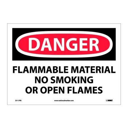 NMC D117PB DANGER - FLAMMABLE MATERIAL NO SMOKING OR OPEN FLAMES Sign - 14 in. x 10 in., Red/Black Text on White, PS Vinyl Danger Sign