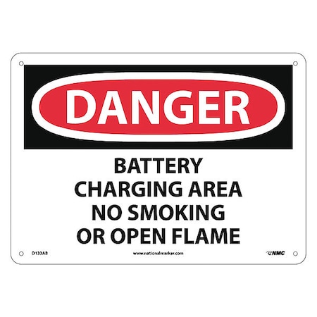 NMC D133AB DANGER - BATTERY CHARGING AREA NO SMOKING OR OPEN FLAMES Sign - 14 in. x 10 in., Red/Black Text on White, Aluminum Danger Sign