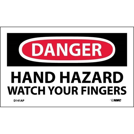 NMC D141AP OSHA Sign, Legend "DANGER - HAND HAZARD WATCH YOUR FINGERS", 5" Length x 3" Height, Pressure Sensitive Vinyl, Black/Red on White (Pack of 5)