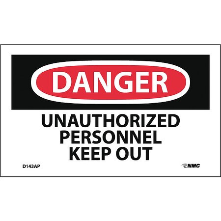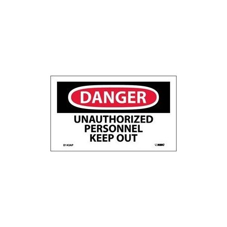 NMC D143AP OSHA Sign, Legend "DANGER - UNAUTHORIZED PERSONNEL KEEP OUT", 5" Length x 3" Height, Pressure Sensitive Vinyl, Black/Red on White (Pack of 5)