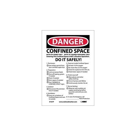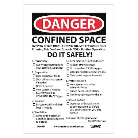 NMC D167P OSHA Sign, Legend "DANGER - CONFINED SPACE DO IT SAFELY", 10" Length x 7" Height, Pressure Sensitive Vinyl, Red/Black on White