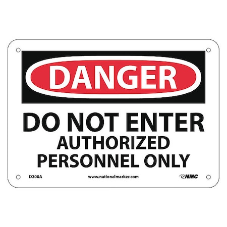 NMC D200A OSHA Sign, Legend "DANGER - DO NOT ENTER AUTHORIZED PERSONNEL ONLY", 10" Length x 7" Height, Aluminum, Black on White
