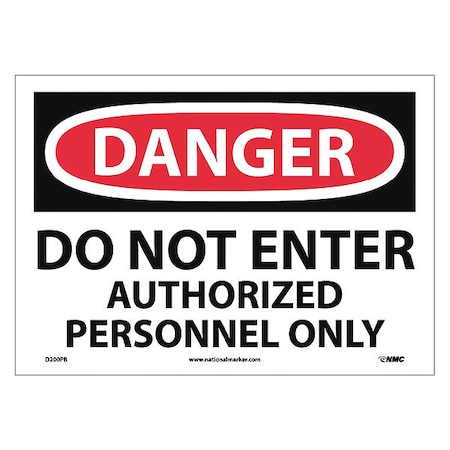 NMC D200PB OSHA Sign, Legend "DANGER - DO NOT ENTER AUTHORIZED PERSONNEL ONLY", 14" Length x 10" Height, Pressure Sensitive Vinyl, Black on White