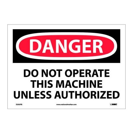 NMC D205PB OSHA Sign, Legend "DANGER - DO NOT OPERATE THIS MACHINE UNLESS AUTHORIZED", 14" Length x 10" Height, Pressure Sensitive Vinyl, Black on White