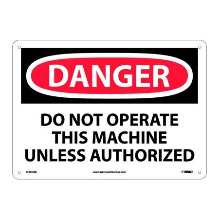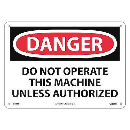NMC D205RB OSHA Sign, Legend "DANGER - DO NOT OPERATE THIS MACHINE UNLESS AUTHORIZED", 14" Length x 10" Height, Rigid Plastic, Black on White