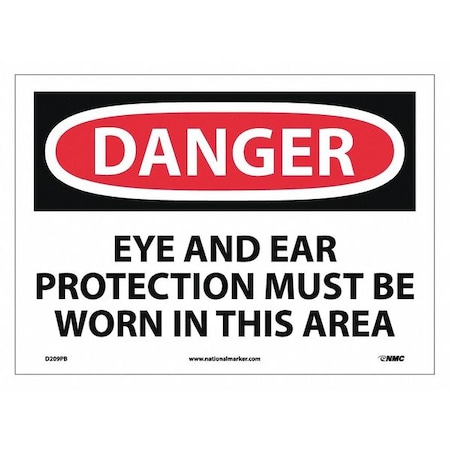 NMC D209PB DANGER - EYE AND EAR PROTECTION MUST BE WORN IN THIS AREA Sign - 14 in. x 10 in. PS Vinyl Danger Sign, Black/White Text on White/Red Base