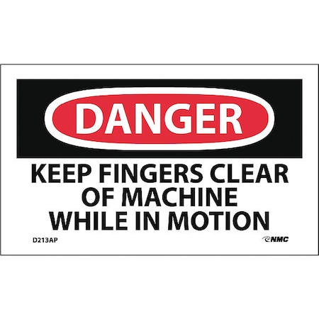 NMC D213AP OSHA Sign, Legend "DANGER - KEEP FINGERS CLEAR OF MACHINE WHILE IN MOTION", 5" Length x 3" Height, Pressure Sensitive Adhesive Vinyl, Black/Red on White (Pack of 5)