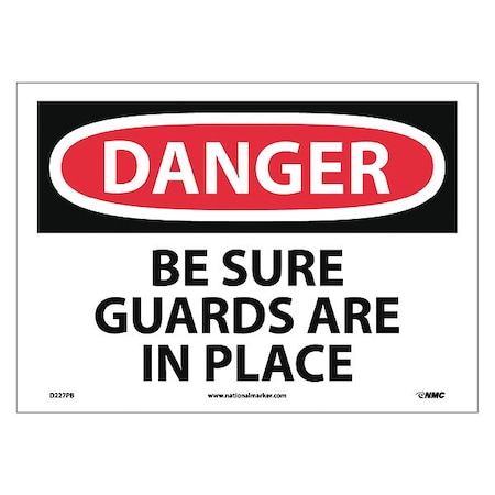 NMC D227PB OSHA Sign, Legend "DANGER - BE SURE GUARDS ARE IN PLACE", 14" Length x 10" Height, Pressure Sensitive Vinyl, Red/Black on White
