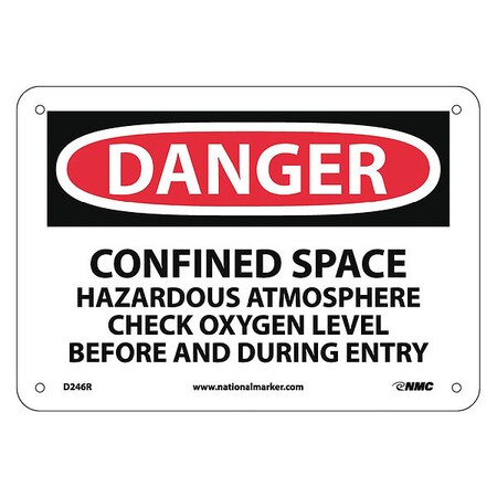 NMC D246R OSHA Sign, Legend "DANGER - CONFINED SPACE HAZARDOUS ATMOSPHERE...", 10" Length x 7" Height, Rigid Plastic, Red/Black on White