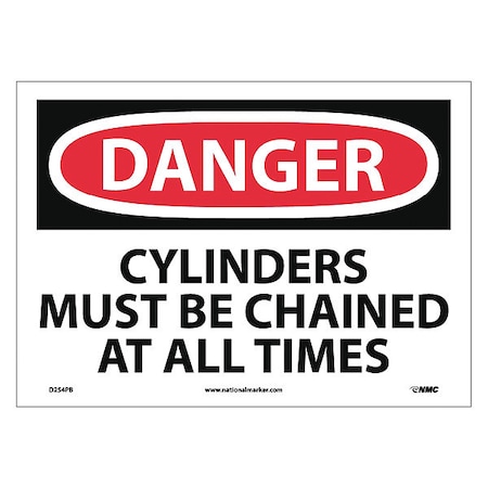 NMC D254PB OSHA Sign, Legend "DANGER - CYLINDERS MUST BE CHAINED AT ALL TIMES", 14" Length x 10" Height, Pressure Sensitive Vinyl, Black on White