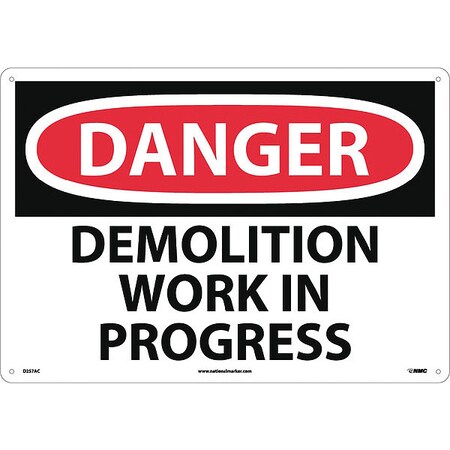 NMC D257AC OSHA Sign, Legend "DANGER - DEMOLITION WORK IN PROGRESS", 20" Length x 14" Height, 0.040 Aluminum, Black/Red on White