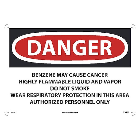 OSHA Sign D27. Legend: Danger Benzene May Cause Cancer Highly Flammable Liquid and Vapor Do Not Smoke Wear Respiratory Protection In This Area Authorized Personnel Only