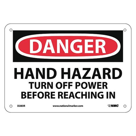 NMC D283R OSHA Sign, Legend "DANGER - HAND HAZARD TURN OFF POWER BEFORE REACHING IN", 10" Length x 7" Height, Rigid Plastic, Black/Red on White