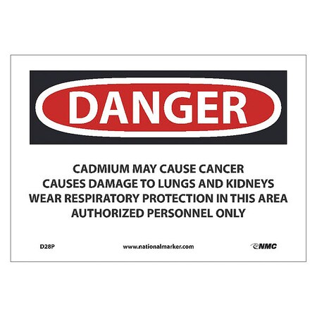 D28P National Marker Danger Cadmium May Cause Cancer Sign, Causes Damage to Lungs and Kidneys Wear Respiratory Protection 7 Inches x 10Inches, Ps Vinyl
