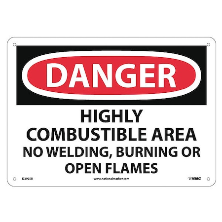 NMC D292EB OSHA Sign, Legend "DANGER - HIGHLY COMBUSTIBLE AREA NO WELDING, BURNING OR OPEN FLAMES", 14" Length x 10" Height, Fiberglass, Black/Red on White