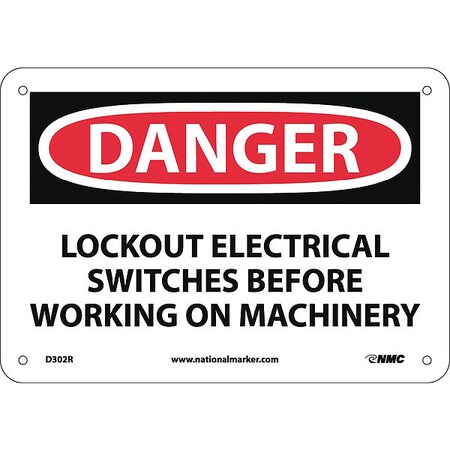 NMC D302R OSHA Sign, Legend "DANGER - LOCKOUT ELECTRICAL SWITCHES BEFORE WORKING ON MACHINERY", 10" Length x 7" Height, Rigid Plastic, Black/Red on White
