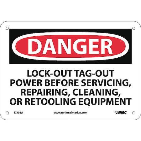 NMC D303A OSHA Sign, Legend "DANGER - LOCKOUT TAGOUT POWER BEFORE SERVICING, REPAIRING, CLEANING OR RETOOLING EQUIPMENT", 10" Length x 7" Height, Aluminum, Black/Red on White