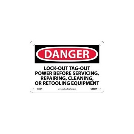 NMC D303R OSHA Sign, Legend "DANGER - LOCKOUT TAGOUT POWER BEFORE SERVICING, REPAIRING, CLEANING OR RETOOLING EQUIPMENT", 10" Length x 7" Height, Rigid Plastic, Black/Red on White