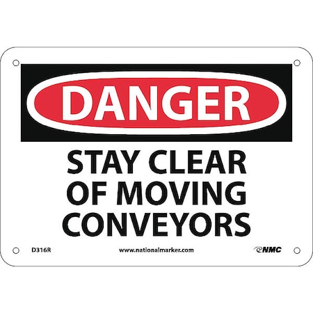 NMC D316R OSHA Sign, Legend "DANGER - STAY CLEAR OF MOVING CONVEYORS", 10" Length x 7" Height, Rigid Plastic, Black/Red on White