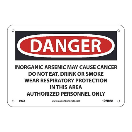 D32A National Marker Danger Sign - Inorganic Arsenic May Cause Cancer Do Not Eat, Drink or Smoke Wear Respiratory Protection 7 Inches x 10Inches, 040 ALUM