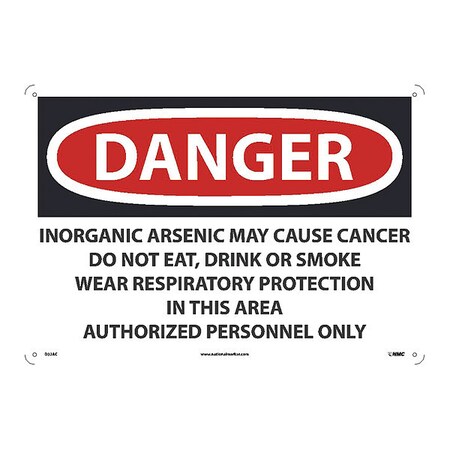 OSHA Sign D32. Legend: Danger Inorganic Arsenic May Cause Cancer Do Not Eat, Drink Or Smoke Wear Respiratory Protection In This Area Authorized Personnel Only
