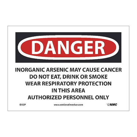 OSHA Sign D32. Legend: Danger Inorganic Arsenic May Cause Cancer Do Not Eat, Drink Or Smoke Wear Respiratory Protection In This Area Authorized Personnel Only