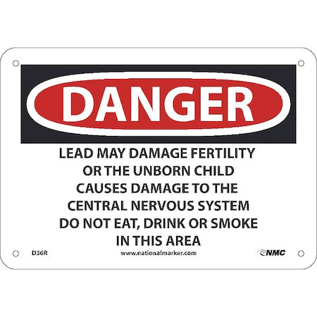 OSHA Sign D36. Legend: Danger Lead May Damage Fertility Or The Unborn Child Causes Damage To The Central Nervous System Do Not Eat, Drink Or Smoke In This Area