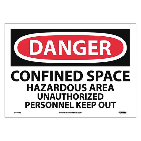 NMC D374PB OSHA Sign, Legend "DANGER - CONFINED SPACE HAZARDOUS AREA UNAUTHORIZED PERSONNEL KEEP OUT", 14" Length x 10" Height, Pressure Sensitive Vinyl, Red/Black on White