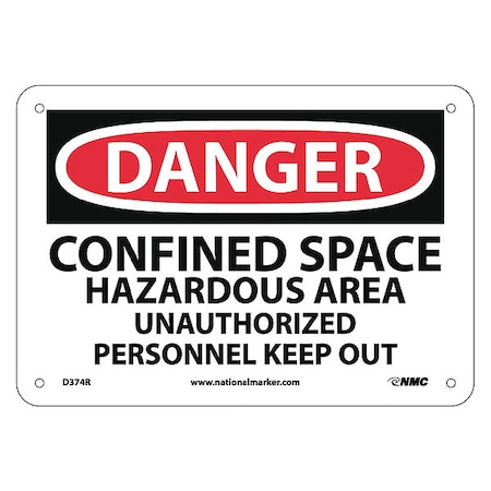 NMC D374R OSHA Sign, Legend "DANGER - CONFINED SPACE HAZARDOUS AREA UNAUTHORIZED PERSONNEL KEEP OUT", 10" Length x 7" Height, Rigid Plastic, Red/Black on White