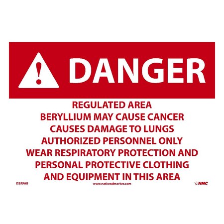 NMC D399AB Danger - Beryllium Regulated Area Sign - 14 in. x 10 in. Standard Aluminum Danger Sign, White/Red Text on Red/White Base