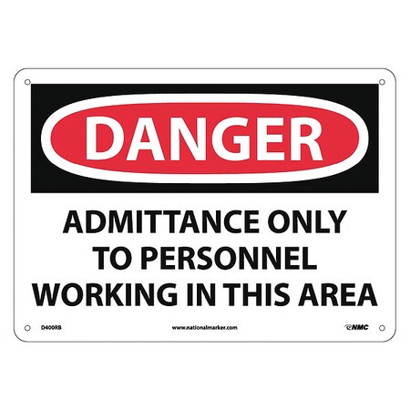 NMC D400RB OSHA Sign, Legend "DANGER - ADMITTANCE ONLY TO PERSONNEL WORKING IN THIS AREA", 14" Length x 10" Height, Rigid Plastic, Red/Black on White