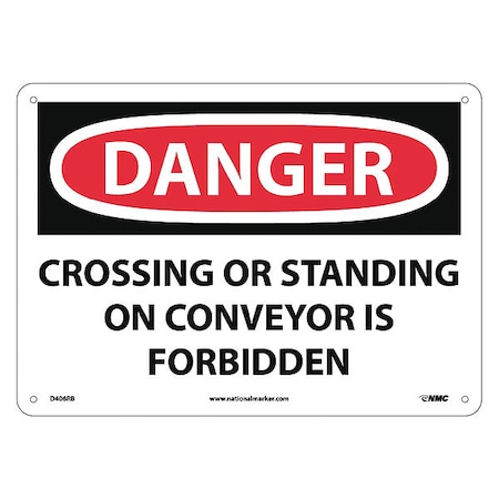 NMC D406RB OSHA Sign, Legend "DANGER - CROSSING OR STANDING ON CONVEYOR IS FORBIDDEN", 14" Length x 10" Height, Rigid Plastic, Black on White