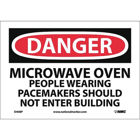 NMC D408P OSHA Sign, Legend "DANGER - MICROWAVE OVEN PEOPLE WEARING PACEMAKERS...", 10" Length x 7" Height, Pressure Sensitive Vinyl, Black/Red on White