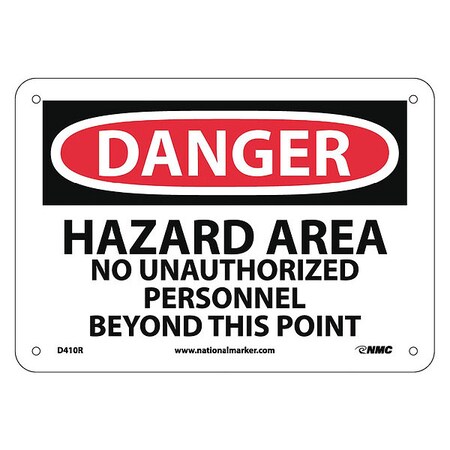NMC D410R DANGER - HAZARD AREA - NO UNAUTHORIZED PERSONNEL BEYOND THIS POINT Signage - 10in. x 7in. Danger Signage with Black/White Text on White/Red Base, Rigid Plastic