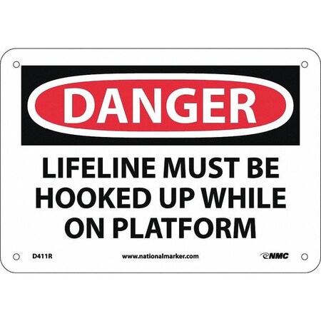 NMC D411R DANGER - LIFELINE MUST BE HOOKED UP WHILE ON PLATFORM Sign - 10 in. x 7 in. Rigid Plastic Danger Signage with Black/White on White/Red