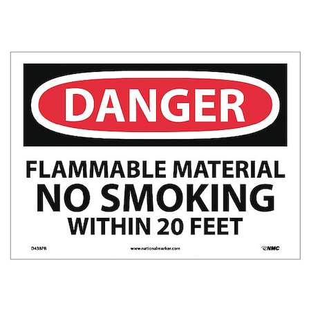 NMC D438PB OSHA Sign, Legend "DANGER - FLAMMABLE MATERIAL NO SMOKING WITHIN 20 FEET", 14" Length x 10" Height, Pressure Sensitive Vinyl, Black/Red on White
