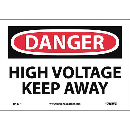 NMC D443P OSHA Sign, Legend "DANGER - HIGH VOLTAGE KEEP AWAY", 10" Length x 7" Height, Pressure Sensitive Adhesive Vinyl, Black/Red on White