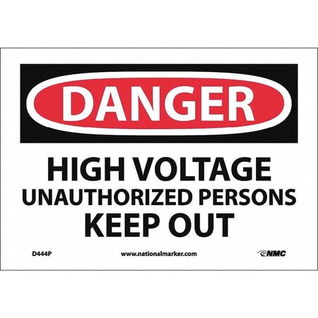 NMC D444P OSHA Sign, Legend "DANGER - HIGH VOLTAGE UNAUTHORIZRD PERSONNEL KEEP OUT", 10" Length x 7" Height, Pressure Sensitive Adhesive Vinyl, Black/Red on White
