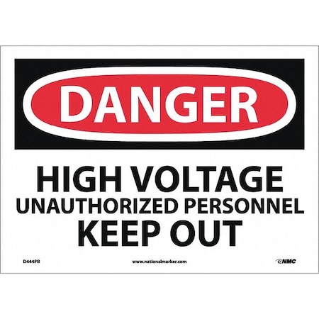 NMC D444PB OSHA Sign, Legend "DANGER - HIGH VOLTAGE UNAUTHORIZRD PERSONNEL KEEP OUT", 14" Length x 10" Height, Pressure Sensitive Adhesive Vinyl, Black/Red on White