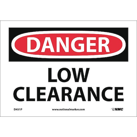 NMC D451P OSHA Sign, Legend "DANGER - LOW CLEARANCE", 10" Length x 7" Height, Pressure Sensitive Vinyl, Black/Red on White